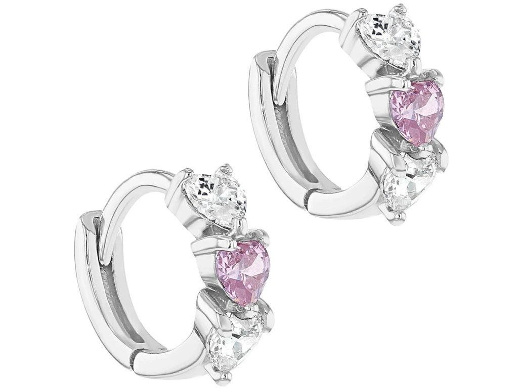 Kroužkové dětské náušnice s růžovým zirkonem ve tvaru srdíčka a dvěma čirými zirkony.