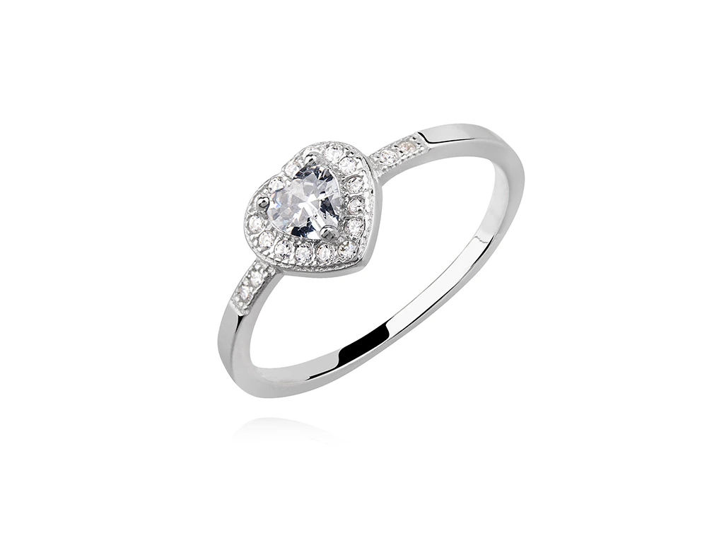 Stříbrný prstýnek s velkým srdíčkovým zirkonem a drobnými čirými zirkony po obvodu.