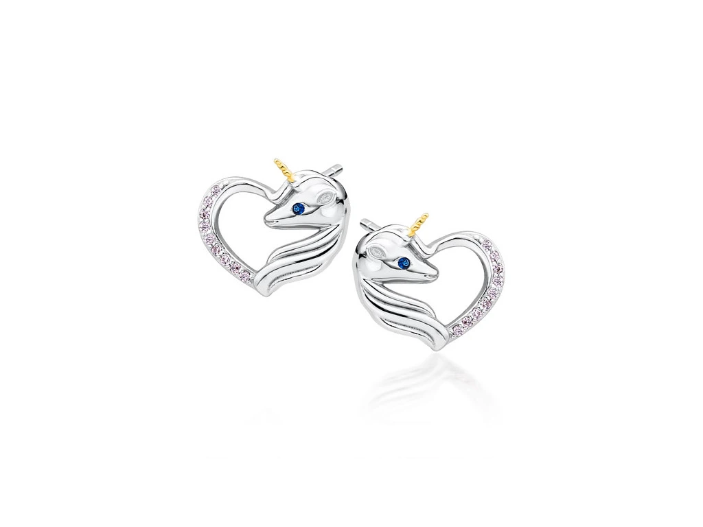 3749 Stříbrné náušnice JEDNOROŽEC V SRDCI Ag 925; ≤2,1 g.