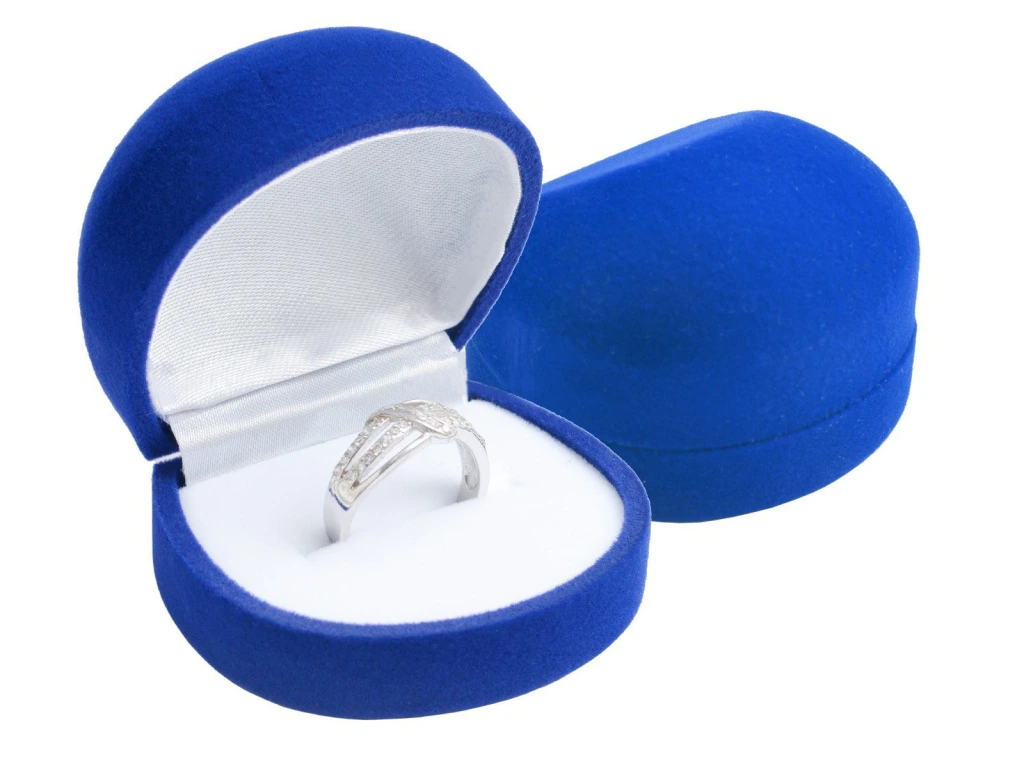 - Modrá sametová dárková krabička s bílým saténem uvnitř víčka.