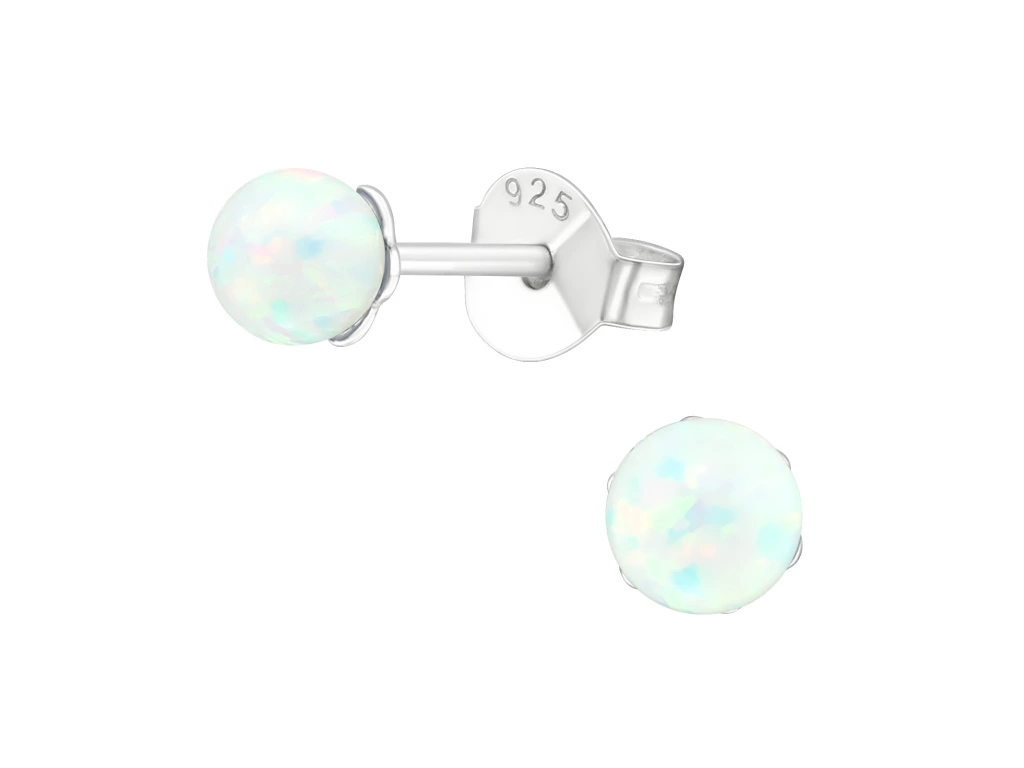 Stříbrné náušnice s bílým laboratorním opálem o průměru 4 mm.