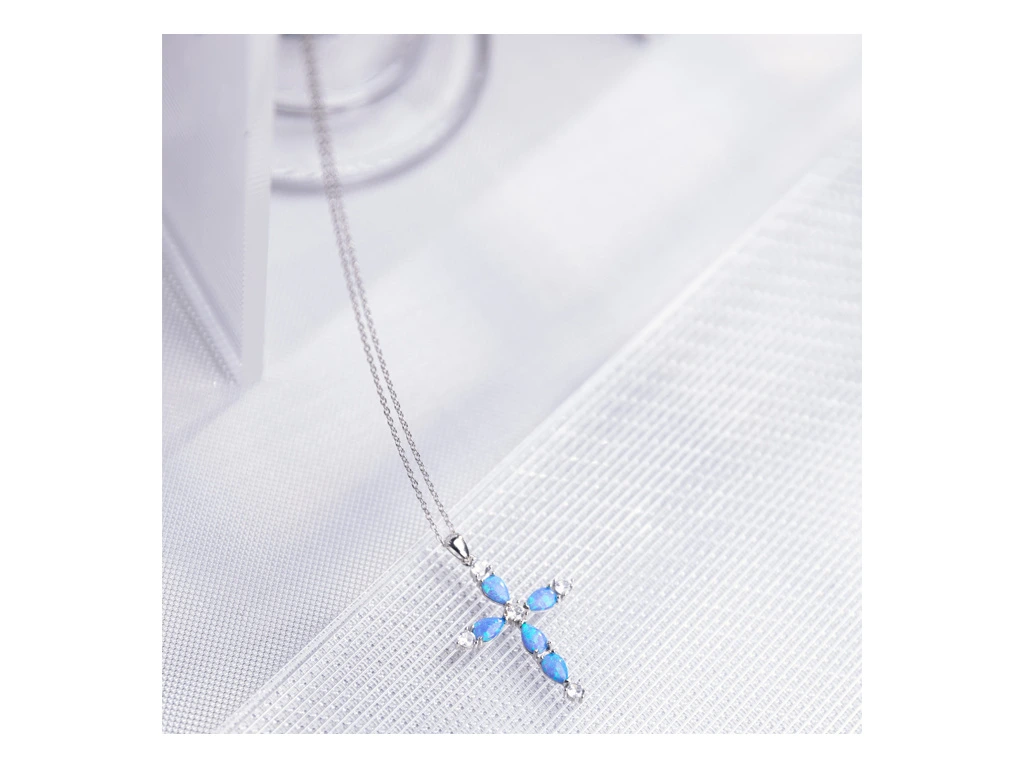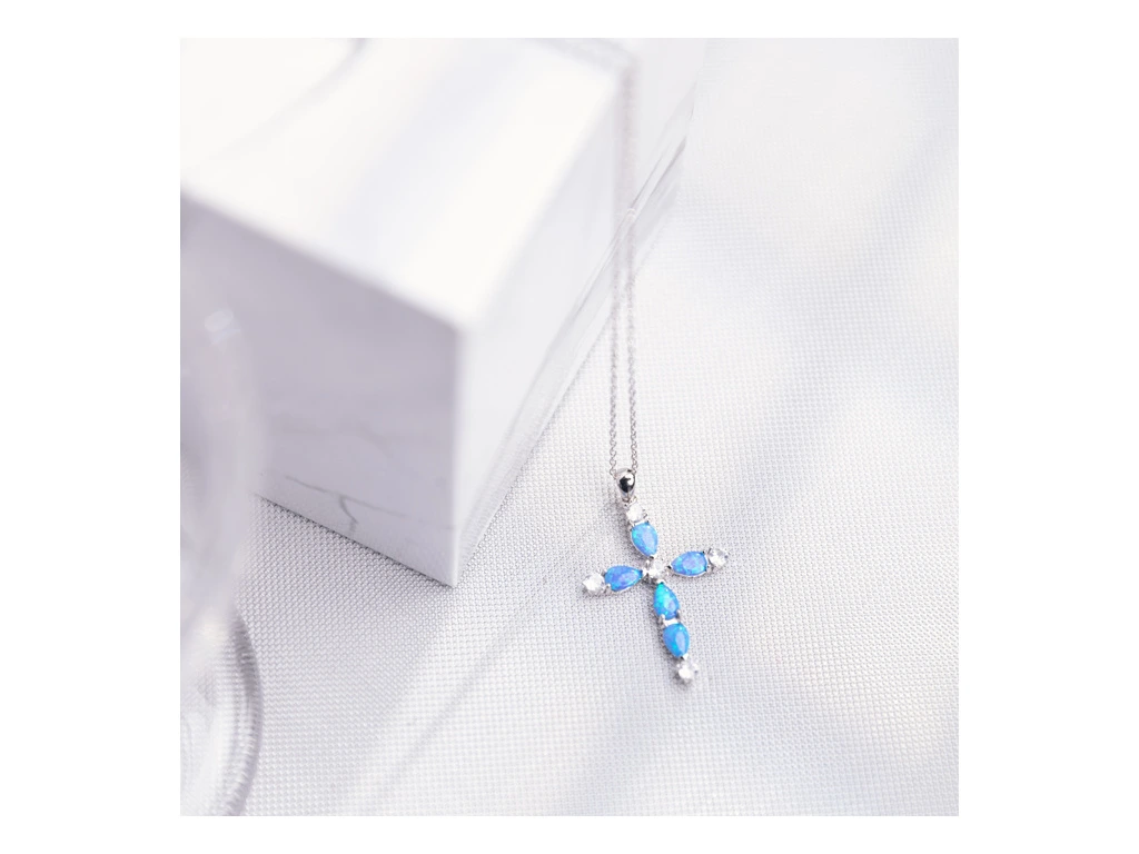Stříbrný náhrdelník OPÁLOVÝ KŘÍŽ v úžasné kombinaci s čirými zirkony a modrými opály.