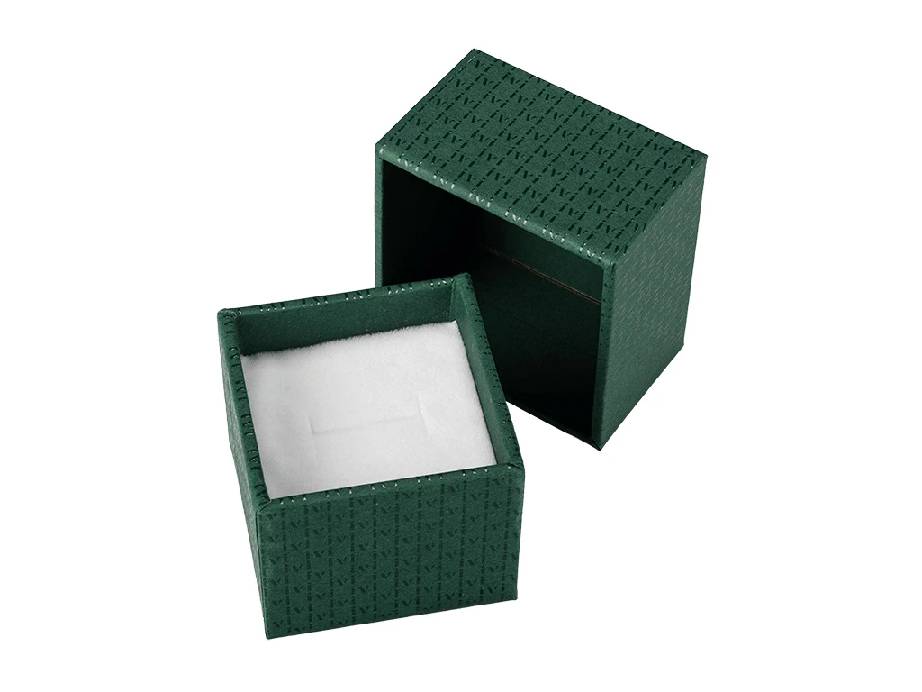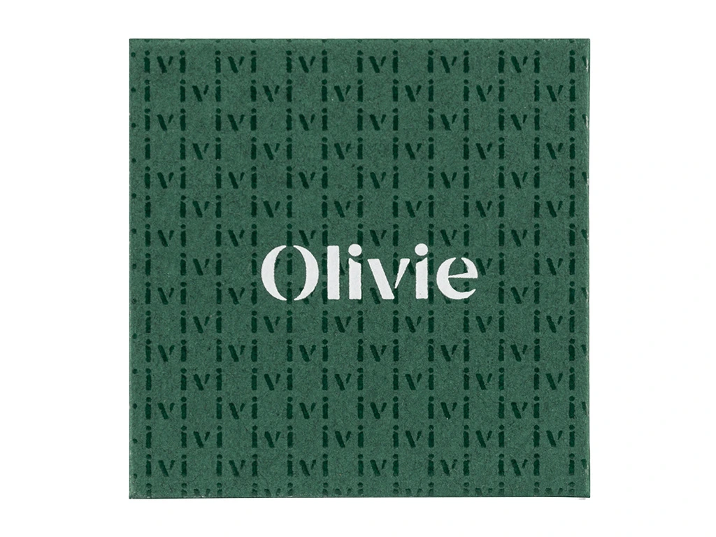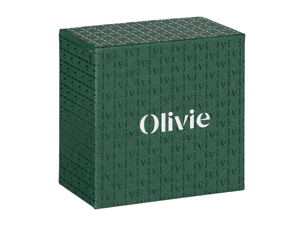 Pevná dárková krabička je vhodná pro uložení prstenu, přívěsku nebo drobných náušnic. Papírová krabička je velmi kvalitní a reprezentativní.  Barva je tmavě zelená s bílým logem Olivie. Sametová poduška uvnitř je bílá.