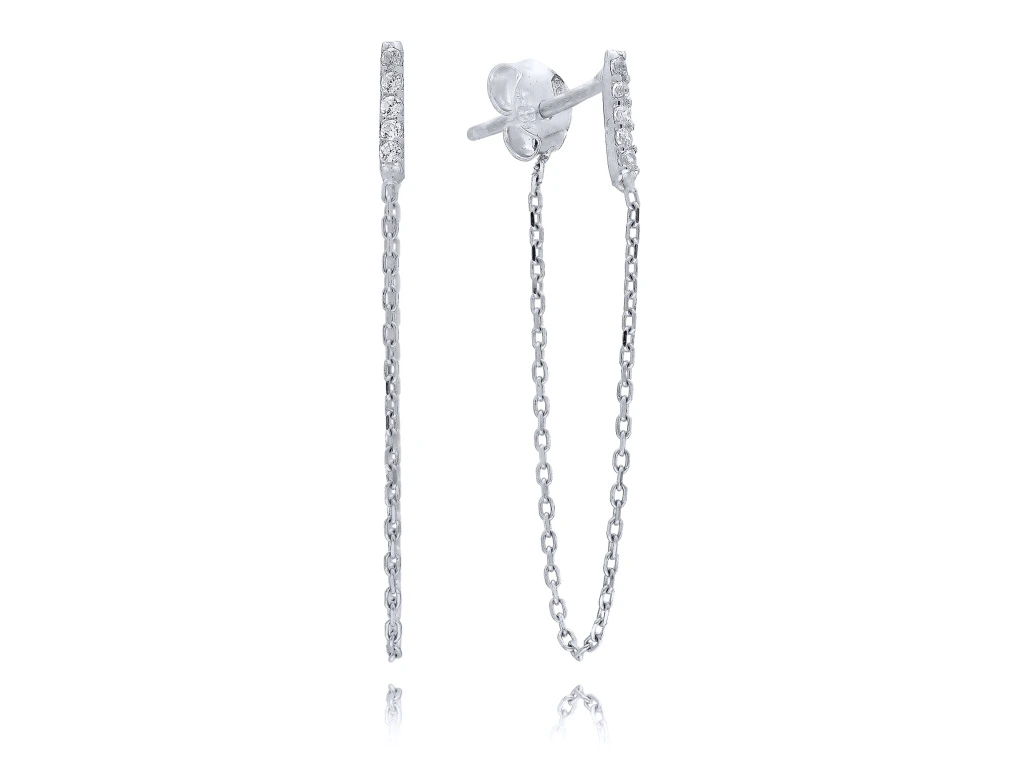 Tyto dámské visací náušnice z bílého zlata ryzosti 585/1000 zaujmou svou lehkostí a minimalistickým designem. Horní část je jemně osazena syntetickými zirkony, které dodávají šperku nenápadný třpyt, zatímco tenký řetízek vytváří elegantní pohyb při každém kroku.