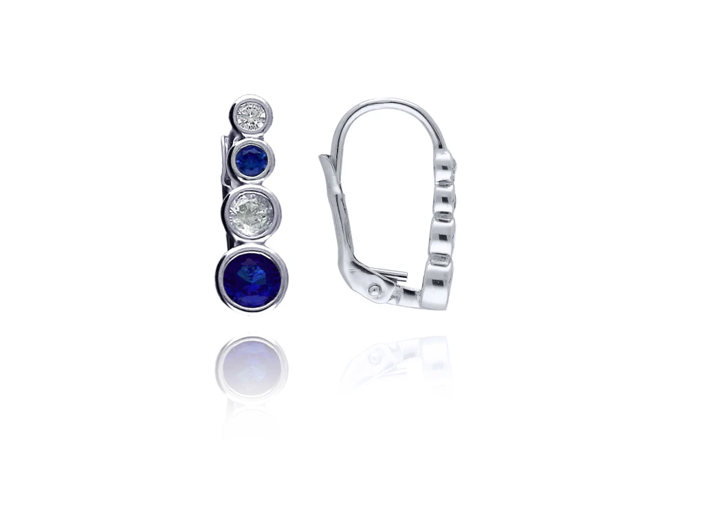 Tyto náušnice přitahují pozornost svým netradičním uspořádáním kamenů – střídají se zde čiré a hluboce modré zirkony, které vytvářejí výrazný, ale elegantně vyvážený efekt. Lesklé bílé zlato 585/1000 podtrhuje barvy kamenů a dodává celému šperku luxusní nádech.
