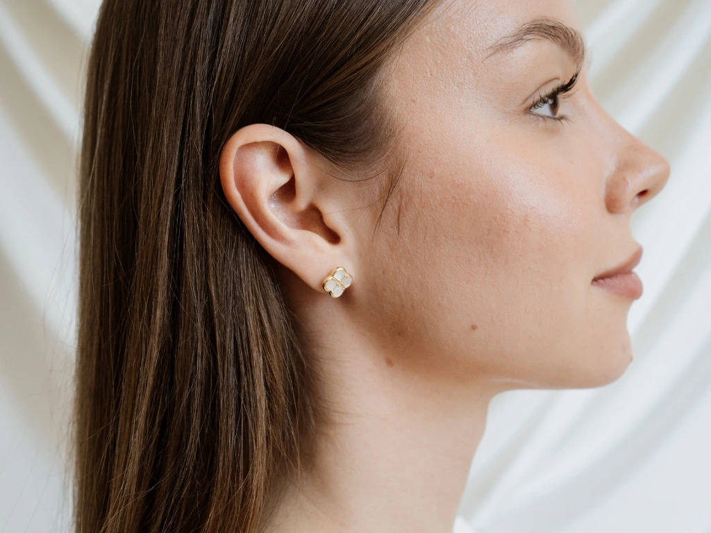 Náušnice ve tvaru stylizovaného čtyřlístku s bílou perletí v hladkém pozlaceném rámečku.