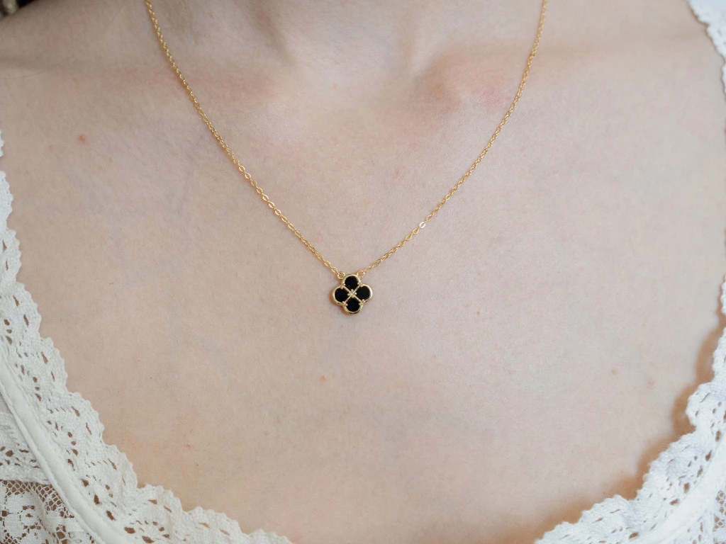 - Černá barva dodává šperku výrazný a elegantní kontrast ke zlacenému rámu.