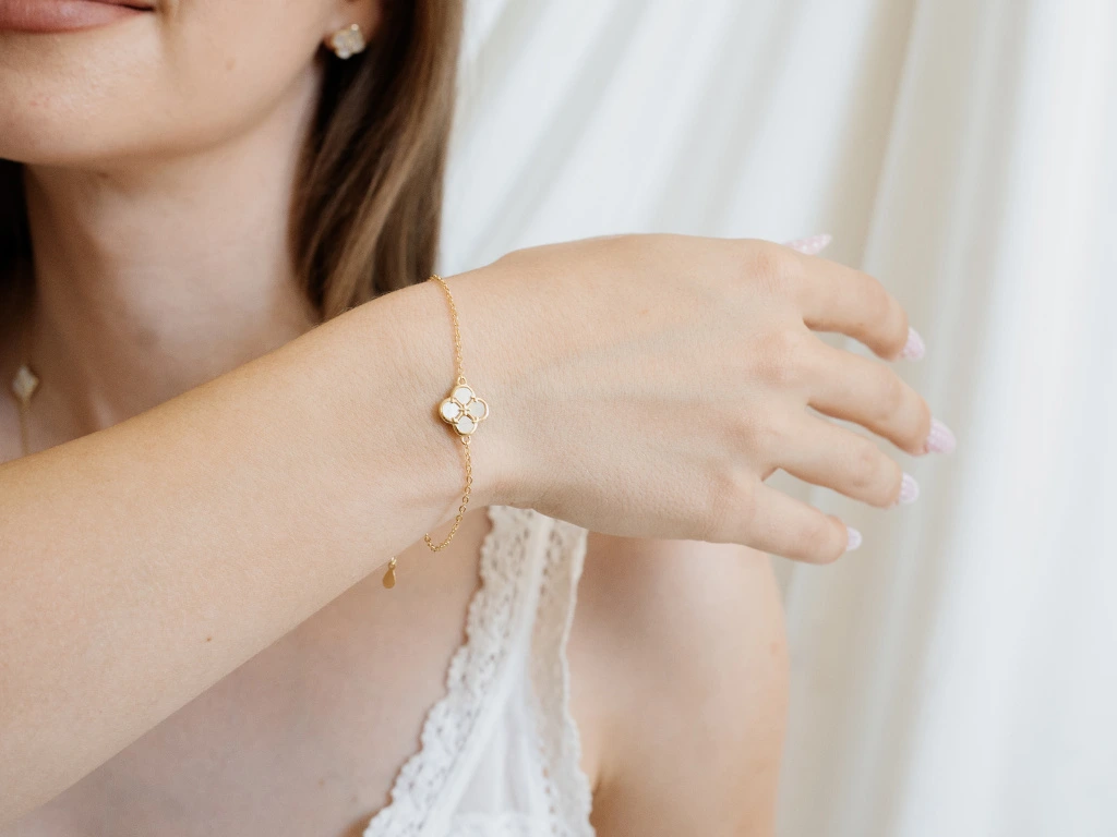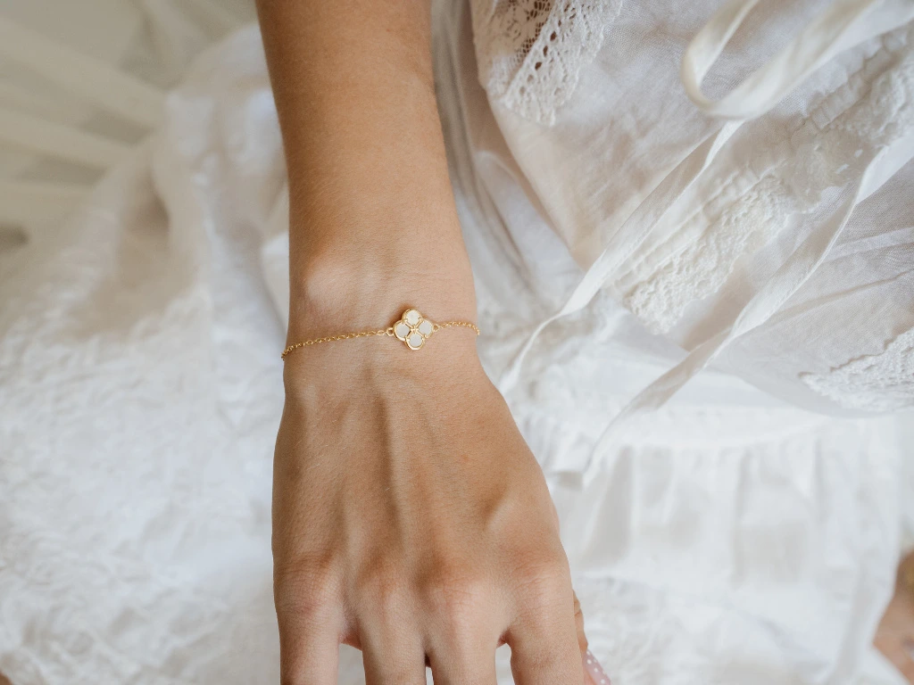 - Elegantní náramek z pozlaceného stříbra s motivem květu v bílé perleti.