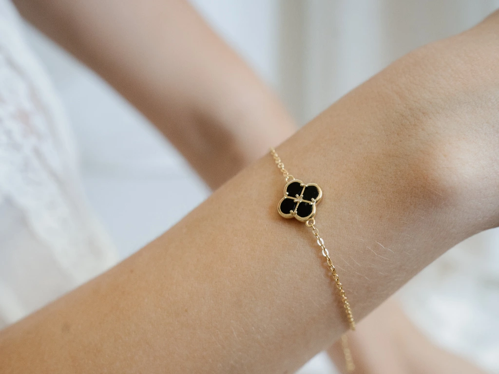 - Elegantní náramek z pozlaceného stříbra s motivem květu v černé perleti.